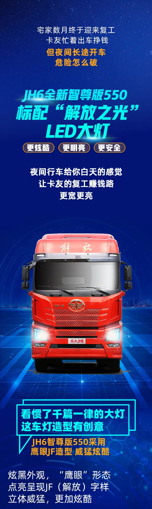 夜間光線暗,視野不足開車不好開?一汽解放青汽JH6全新智尊版550,標(biāo)配“解放之光”LED大燈,更炫酷、更...