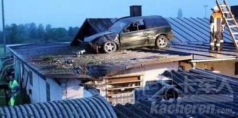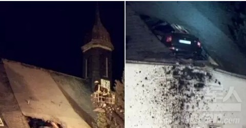 在德國(guó),一輛車撞到教堂的屋頂。據(jù)警察調(diào)查,司機(jī)開車太快,忘記轉(zhuǎn)彎,一直向前開到一個(gè)高處,然后就“飛”到教堂頂端。