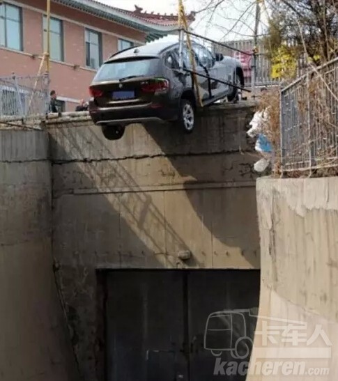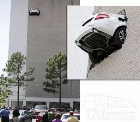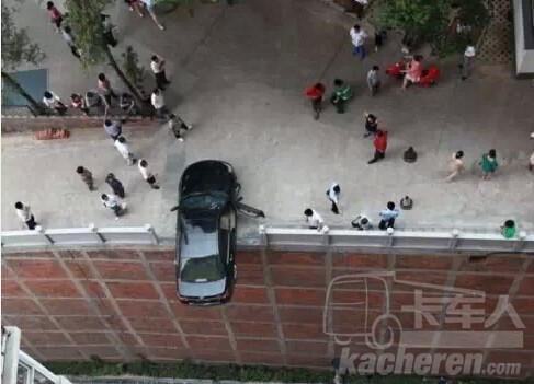 在長(zhǎng)沙一個(gè)15米高的頂層停車場(chǎng),一對(duì)夫婦在停車時(shí)誤踩油門,使車沖過(guò)護(hù)墻,吊在15米高樓頂?shù)倪吘墶P液茫俗罱K小心爬出,沒(méi)有受傷。