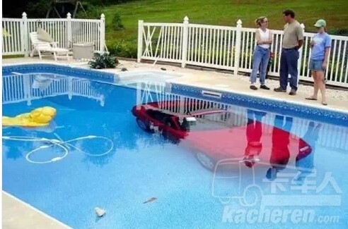 一輛紅色馬自達(dá)Miata在美國(guó)費(fèi)城斯圖爾茨敦一戶人家的游泳池池底。因?yàn)樗麄兊泥従記](méi)有剎車,直接開進(jìn)了游泳池里。