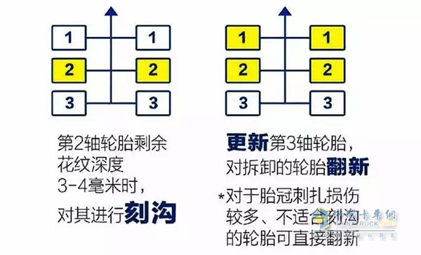 掛車方面,以三軸半掛為例,三個軸上的所有輪胎全部換新后,當第三個軸的輪胎磨損至50%的時候,建議將第2、3軸的輪胎進行交叉調換。除此之外,還可通過輪胎刻溝、翻新的辦法,花最低的成本最大化的給輪胎來一次大保健。