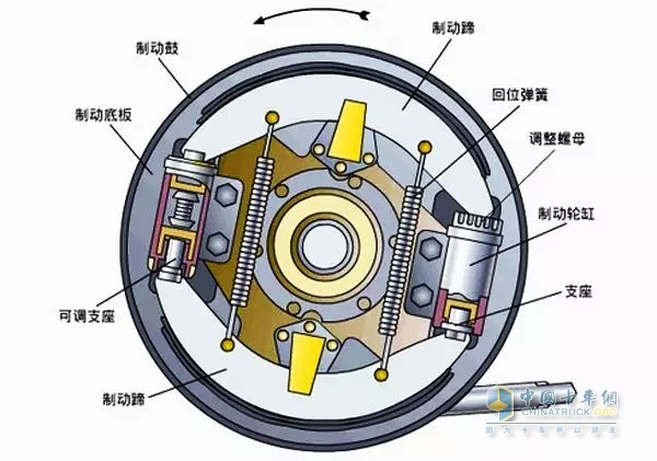 在制動鼓內設置了兩組制動蹄片,在我們踩下制動踏板的時候,駕駛員的力量會傳遞給制動蹄片,頂動兩邊的半圓弧狀U形制動蹄片,使其膨脹向外擠壓,將制動蹄片緊壓在制動鼓上。此時制動鼓與制動蹄片之間會發(fā)生強烈的摩擦從而起到制動效果。