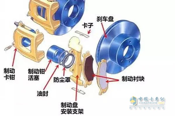 氣室固定在制動器的底板上固定不動,制動鉗上的兩個摩擦片分別裝在制動盤的兩側,氣室的活塞受氣管輸送來的氣壓作用,推動摩擦片向制動盤發(fā)生摩擦,就好像用鉗子鉗住旋轉中的盤子,達到減速剎車的作用。