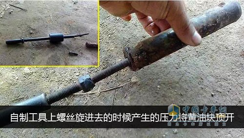 他在用自制的工具拆下鋼板銷的時候,發現堵住油孔的干黃油塊居然被頂開了。后來車主仔細想了很久,應該是自制工具上那可螺絲旋進去的時候產生的壓力將黃油塊頂開了。