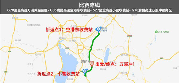 昆明站總決賽路線以渝昆高速萬(wàn)溪沖服務(wù)區(qū)為比賽起止點(diǎn),途徑昆明空港區(qū)、滇中新區(qū)、呈貢區(qū)、玉溪所連接的渝昆高速,總里程83公里,車貨總重49噸,限時(shí)110分鐘。