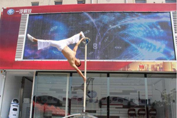 卡友簽到后,陸續入場,演藝人員為現場卡友帶來了精彩的熱場節目—雜技“力與美”,只見年輕的表演者,利用雙臂的力量支撐在鐵桿之上,不斷做著難度較大的動作,現場卡友不禁發出陣陣贊嘆,這威武雄壯的解放卡車,何嘗不是力與美的結合呢。