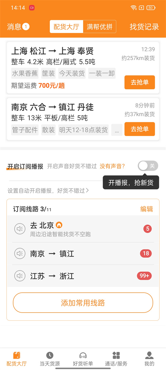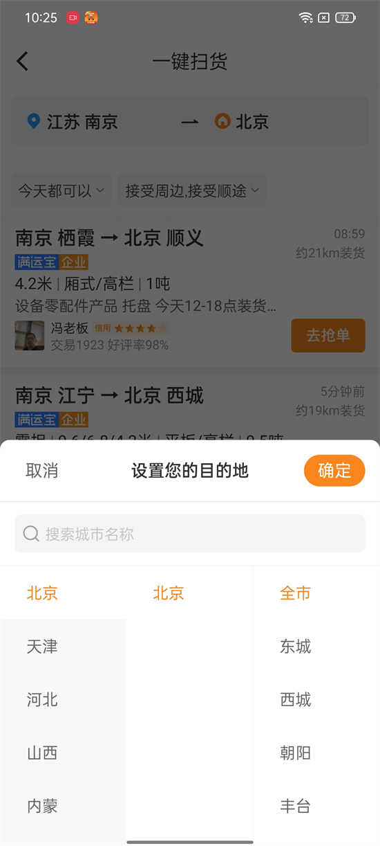 以南京-北京為例,通過“一鍵掃貨”功能,司機能額外看到南京周邊到北京、南京到北京周邊、南京周邊到北京周邊、南京出發到連云港裝貨送往北京的貨源