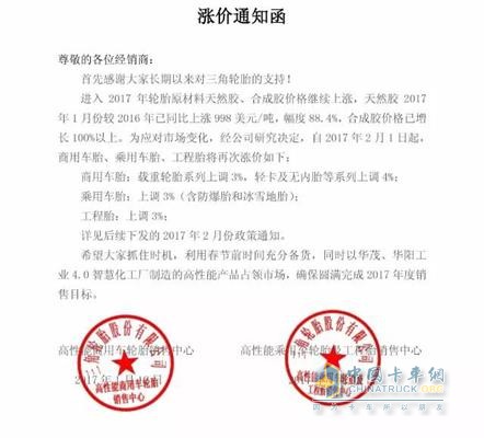 三角輪胎漲價通知函