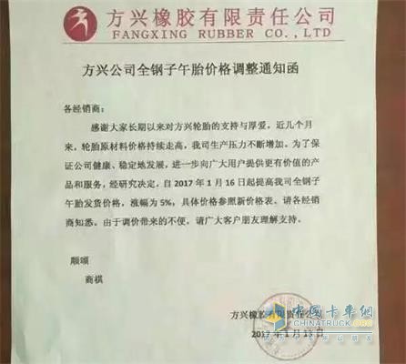 方興全鋼子午線輪胎漲價通知函