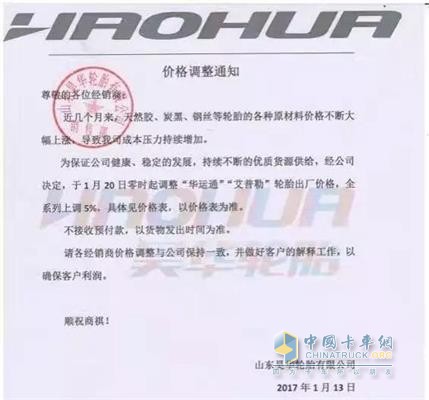 自2017年1月20日零時起調整“華運通”、“艾普勒”輪胎出廠價格,全系列上調5% 。