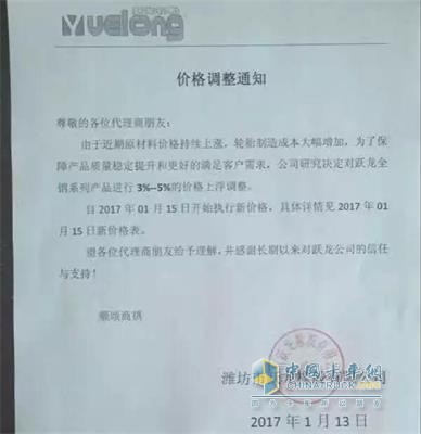 自2017年1月15日開始執行新價格,對躍龍全鋼系列產品進行3%-5%的價格上調。
