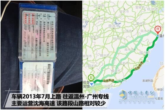 經過一晚的短暫等待,第二天10點多劉輝駕駛著汕德卡回到了廣州倉庫,并沒有過多寒暄,停車、摘掛、吃飯、加油、拿好貨單、裝掛一系列動作完成之后。中午12:30,車輛順利從廣州倉庫出發開往溫州。此時,記者才有機會好好“端詳”二位司機和他們駕駛的汕德卡。