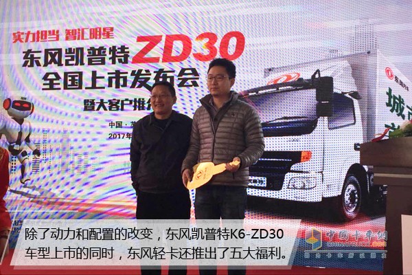 除了動力和配置的改變,東風凱普特K6-ZD30車型上市的同時,東風輕卡還推出了五大福利。一超長質保。發動機最長部件質保期4年150萬公里,變速箱最長部件質保期18個月不限里程,車橋最長部件質保期24個月不限里程。二只換不修承諾(免揭蓋直接更換總成)。發動機1年2萬公里內,發生需開蓋維修的故障免揭缸蓋直接更換總成。變速箱、車橋購車3月內,發生需開蓋維修的故障免開箱直接更換總成。三免費送保養。購ZD30車型,直接贈送3次免費保養,再送免費尿素噴嘴檢查一次。四限時服務。電話限時接通,外出限時到達,備件限時調達,故障限時修復。五全程VIP待遇。ZD30車型專享專修工位,車輛回站后可以優先保養,優先維修,“零等待”,更加快捷省時。