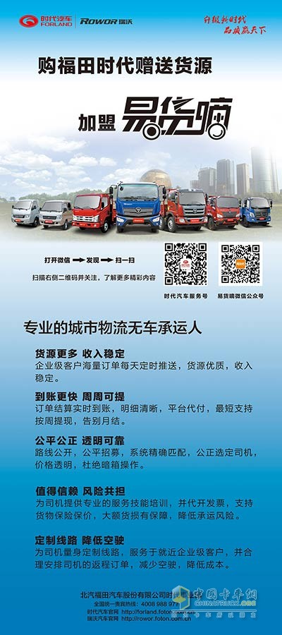 2017年1月,福田時代與易貨嘀平臺建立合作關系,合作方向即商用車型采購,易貨嘀平臺將福田時代的產品作為唯一選購車型。自合作建立以來,雙方先后在杭州、青島兩大業(yè)務重點區(qū)域開展了多項活動,其中,“易貨嘀杭州站五星司機啟動會”、“青島站城市司機招募會”兩大活動就是福田時代為新老客戶提供創(chuàng)富途徑的實踐之作。