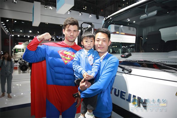 車展首日,這款車型吸引了很多現場觀眾駐足觀看,猛男型的超人模特與躍進輕卡車型碰撞出的炫目火花,也使得上汽躍進展臺成為了商用車展臺中最有人氣的展臺。