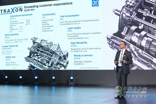 采埃孚商用車事業部卡車與輕客傳動技術業務單元銷售總監Mr.Reimund Neier講解采埃孚全新一代TraXon變速箱