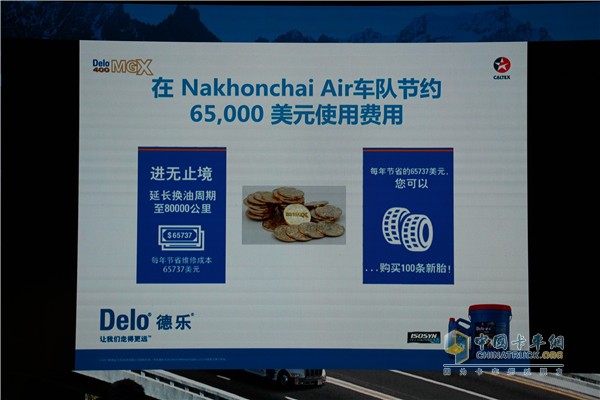 據了解,德樂400MGX產品在新型發動機上可實現8萬公里(車輛)或750小時(非道路)的換油周期,可大幅度的節省實際運營的成本。雪佛龍公司德樂品牌技術經理Greg Croce先生告訴中國卡車網記者,德樂400MGX機油延長換油周期至8萬公里后,每年可為Nakhonchai Air車隊節省維修成本65737美元。節省的維修成本相當于購買100條新輪胎。