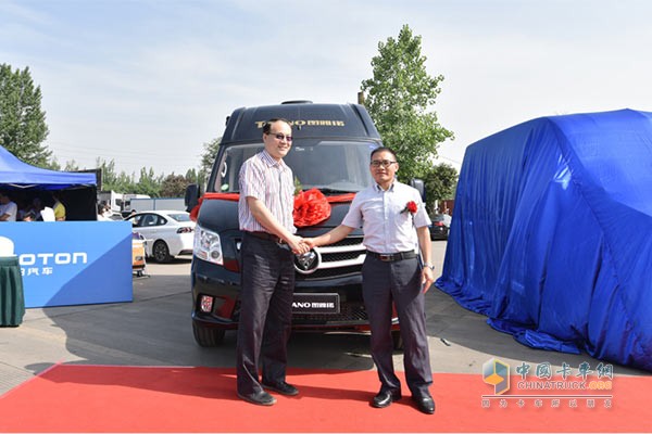福田商用汽車集團商務汽車業務總監、輕型商用車事業本部執行副本部長潘林波先生向四川富臨運業集團股份有限公司車輛技術管理部總監羅明飛先生遞交福田圖雅諾車鑰匙