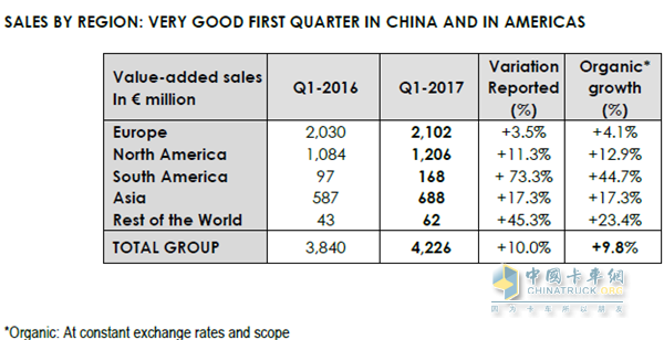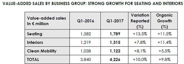 據(jù)佛吉亞官網(wǎng)發(fā)布的數(shù)據(jù)顯示,2017年第一季度,佛吉亞銷售額實現(xiàn)平穩(wěn)增長,漲幅達到9.8%,旗下三大業(yè)務部門表現(xiàn)均十分搶眼。佛吉亞第一季度的增值稅銷售額在中國地區(qū)的漲幅達到22.5%,而在北美地區(qū)的漲幅為12.9%。