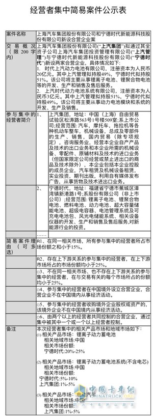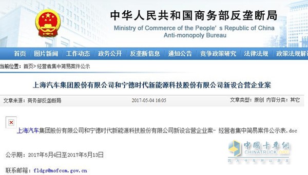 2017年5月3日,商務(wù)部反壟斷局官方網(wǎng)站上發(fā)布了一個(gè)關(guān)于《上海汽車集團(tuán)股份有限公司和寧德時(shí)代新能源科技股份有限公司新設(shè)合營企業(yè)案》公示。公示顯示,上汽集團(tuán)將通過其全資子公司上海汽車集團(tuán)投資管理有限公司與寧德時(shí)代新設(shè)兩家合營企業(yè),時(shí)代上汽動(dòng)力電池有限公司和上汽時(shí)代動(dòng)力電池系統(tǒng)有限公司。