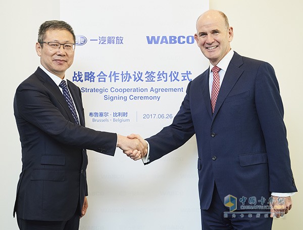2017年6月26日,一汽解放與威伯科在布魯塞爾簽署戰略合作框架協議。一汽解放汽車有限公司黨委書記、總經理胡漢杰先生及威伯科全球董事會主席兼首席執行官Jacques Esculier先生出席簽約儀式并簽署戰略合作框架協議。