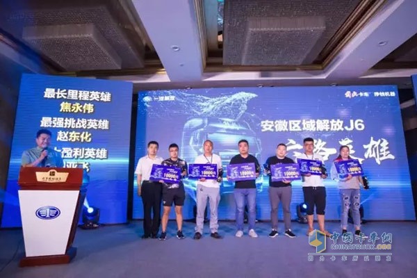 一汽解放安徽商代處總經(jīng)理張傳利先生為六大英雄頒發(fā)了獎品和獎杯。作為解放J6用戶的杰出代表,他們表示:能獲得這項榮譽非常開心,未來會一如既往地支持解放,也相信一汽解放新J6定能給卡友創(chuàng)造更大的價值。