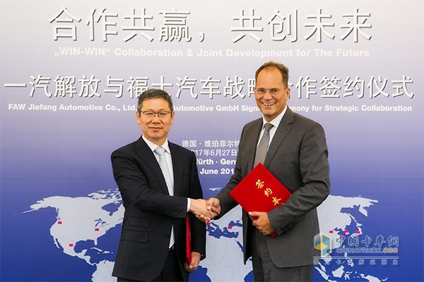 2017年6月27日,一汽解放與福士(VOSS)在德國科隆簽署戰略合作框架協議,開啟全面戰略合作伙伴關系。雙方將在品牌建設、產品研發、市場營銷、技術支持、業務拓展等領域展開深入合作。一汽解放汽車有限公司黨委書記、總經理胡漢杰先生及福士集團CEO Thomas Roethig 博士出席簽約儀式并簽署戰略合作框架協議。