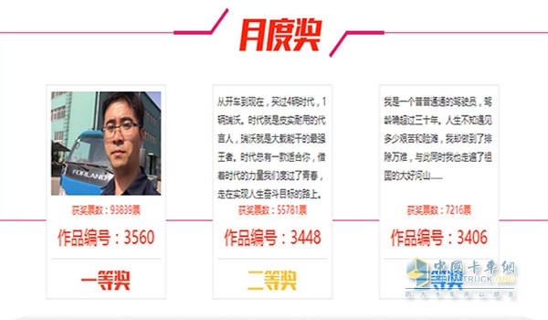 通過一個月的評選,用戶董杰《最好的時代和最好的時代》、陳波提交的《悠悠時代情 不老瑞沃心》、以及劉宗馬《做一名合格卡車駕駛員》分別以92917票、42938票、7082票的成績分獲六月份的冠亞季軍,同時也將獲得由福田時代&瑞沃提供的800元加油卡、仿真車模和藍牙音箱。
