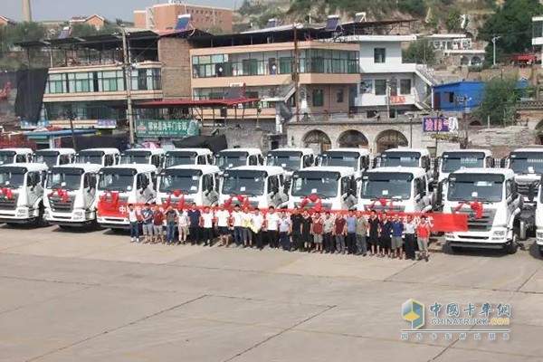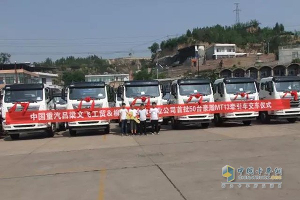 2017年7月14日,伴隨著一陣喜慶的鞭炮聲,呂梁文飛工貿50臺豪瀚MT13天然氣牽引車交付用戶,投入了它主人的懷抱,為呂梁地區的環保事業貢獻一份力量。