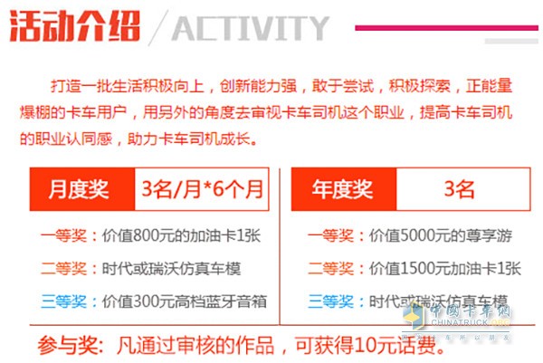 有財力雄厚的福田時代&瑞沃的支持,出彩卡車人活動獎項設置簡直不要太放福利。年度獎三名,獎品分別是:價值5000元尊享游、價值1500元加油卡、時代或瑞沃仿真車模;月度獎三名(每月一選),獎品分別是:價值800元加油卡、時代或瑞沃仿真車模、價值300元高檔藍牙音箱。