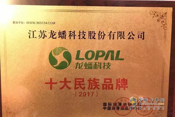 龍蟠潤滑油榮獲組委會頒發的“十大民族品牌”稱號