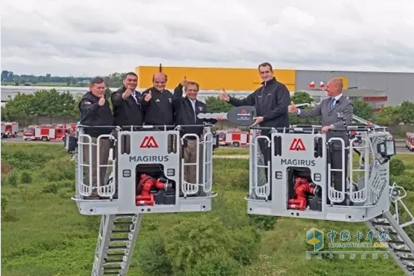 為此馬基路斯邀請高級客戶代表到德國烏爾姆的Magirus總部舉辦的客戶驗收路演。所有待交付的消防車也排列在Magirus工廠中心測試點,供客戶驗收。
