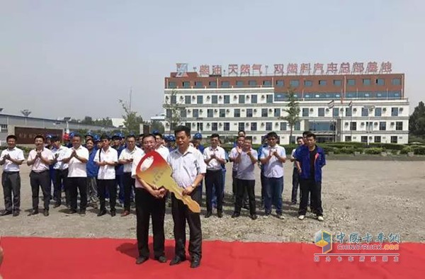 最后,在所有與會代表的共同見證下,華菱星馬汽車集團董事長劉漢如將代表車輛交付使用的金鑰匙遞交給新能裝備董事長武常生,自此標志著搭配了漢馬鉆石動力鏈的漢馬系列車型,將正式服務于新能裝備公司!