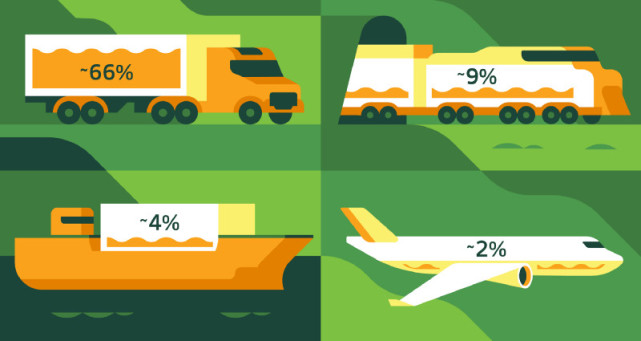 在美國國內每年運輸的上百億噸貨物中,有66%使用公路貨運,9%使用鐵路運輸,4%使用水運,2%使用空運或其他聯運方式。剩下19%則是通過管道等固定基礎設施來運輸的。