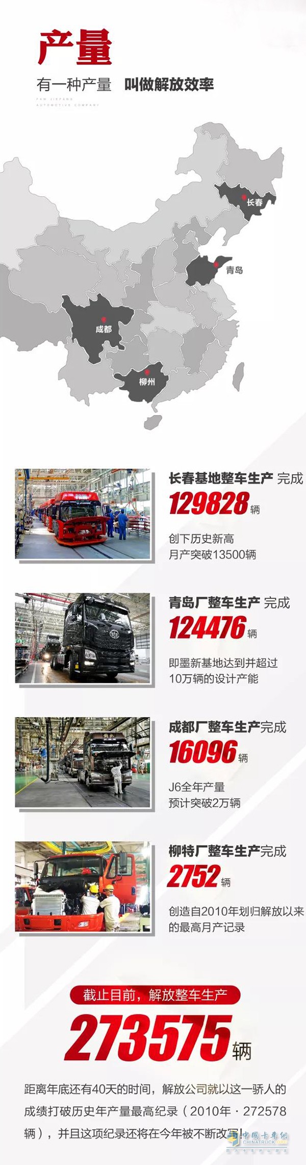 產(chǎn)量銷(xiāo)量雙項(xiàng)騰飛,質(zhì)量服務(wù)持續(xù)領(lǐng)航,截止目前,解放整車(chē)生產(chǎn)273575輛,打破歷史年產(chǎn)最高紀(jì)錄。