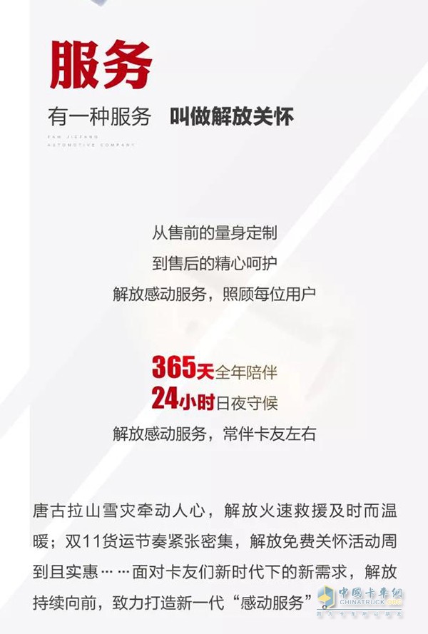 有一種服務(wù)叫解放關(guān)懷,從售前到售后的精心服務(wù),解放常伴卡友左右。