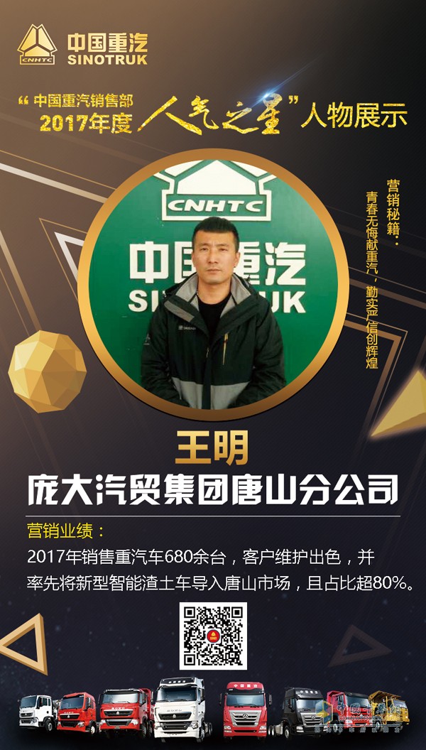 商場如戰場,一線營銷員就是浴血拼斗的戰士,中國重汽銷售部在2017年既收獲了口碑也收獲了訂單,一線營銷員功不可沒。為激勵更多業務員的積極性和榮譽感,中國重汽銷售部舉辦了這次年度人氣之星評選大賽。本次評選的人氣之星均選自中國重汽銷售部備案的一級經銷網絡中,均為豪沃、豪瀚品牌銷售、服務做出突出貢獻的營銷人員,他們深耕重汽多年,有著獨到的營銷經驗和豐富的個人魅力,更有自己的故事。