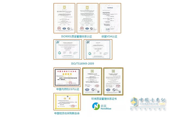 回顧2017年,山東新藍環保科技有限公司,可謂碩果累累。短短一年間,新藍環保先后獲得世界權威(德國汽車工業協會)VDA AdBlue認證、ISO9001質量體系認證、TS16949認證、API標準認證、SGS認證、歐盟reach及國內環評認證、知識產權認證、多項專利等相關認證,并成為中國內燃機協會車用尿素水溶液分會(CGT)會員單位等。