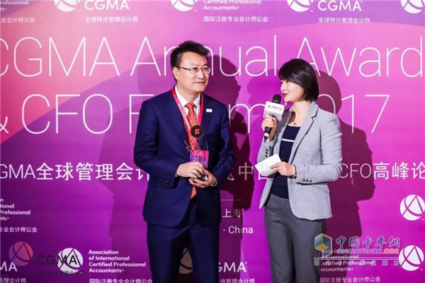 伊頓亞太區(qū)財(cái)務(wù)副總裁金巖(左)在領(lǐng)取“年度財(cái)界領(lǐng)袖”獎(jiǎng)后接受采訪