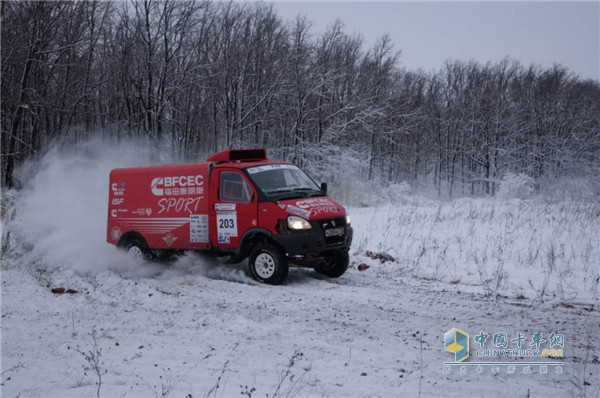 比賽中,由于烏里揚諾夫斯克突降大雪,氣溫達到零下10度,更是給所有車手和領(lǐng)航員帶來了極大的挑戰(zhàn)。所有車手都要在這樣惡劣的天氣下完成300多公里的賽程。但賽車手并沒有被嚇倒,反而激發(fā)了大家的斗志。在惡劣環(huán)境下參賽車輛之間的差距會縮小,更多的是考驗車手之間的車技。