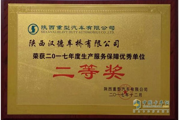 漢德車橋榮獲陜汽重卡“2017年度生產服務保障優秀單位二等