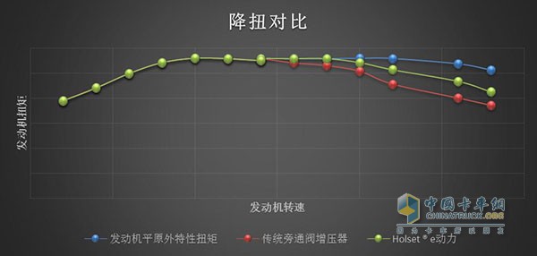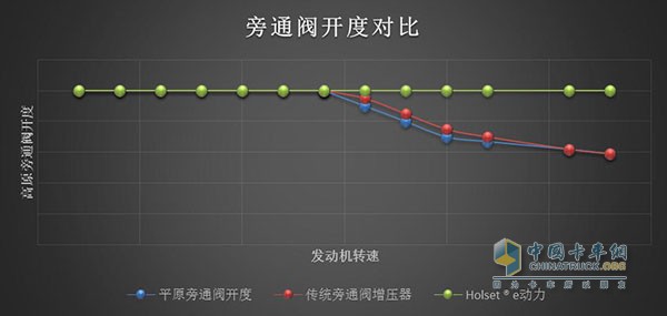 高原地區(qū),隨著海拔升高,空氣越來越稀薄,發(fā)動(dòng)機(jī)進(jìn)氣量降低,為保證發(fā)動(dòng)機(jī)的煙度要求,以及增壓器轉(zhuǎn)速排溫限制,就需要對(duì)發(fā)動(dòng)機(jī)進(jìn)行高原降扭。Holset ® e動(dòng)力,相比傳統(tǒng)的氣動(dòng)旁通閥增壓器,將旁通閥開啟方式從被動(dòng)的氣體推動(dòng)改為主動(dòng)電控調(diào)節(jié)控制,可以在高海拔地區(qū),主動(dòng)控制旁通閥關(guān)閉,進(jìn)行進(jìn)氣補(bǔ)償,充分發(fā)揮增壓器性能,有效的降低高原降扭幅度,提高整車高原能力。