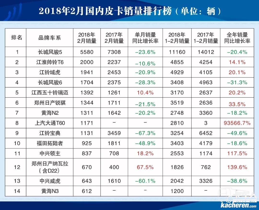 2018年剛開春,江淮帥鈴T6皮卡便傳來喜報,二月份帥鈴T6銷售2000輛,一舉躍升銷量亞軍,打破了長城、江鈴多年蟬聯冠亞軍的神話。因受春節和排放法規升級等因素影響,年后皮卡市場的銷售比較冷清,2018年1-2月份,皮卡市場累計銷售55947輛,同比增長率-2.20%,相比之下,江淮帥鈴T6卻逆市上揚,1-2月份銷售增長率為14.2%,成為皮卡行業增速最快的品牌。