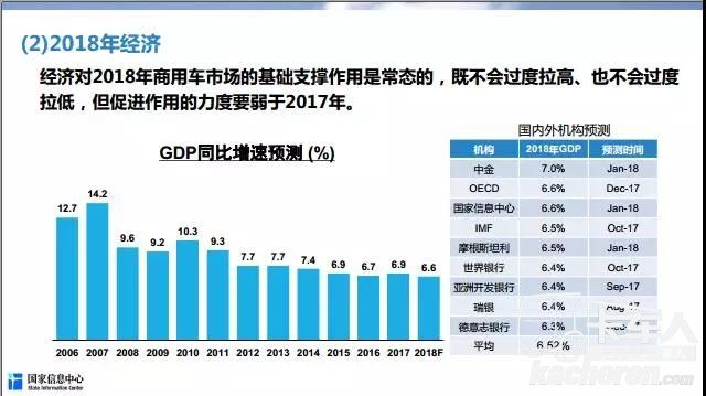 從宏觀經濟來看,謝國平分析,“2018年,預測GDP增速是6.6%,相比2017年6.9%,下滑0.3個百分點。”對于商用車的支撐,不能說太好,也不能說太差,但是相比2017年會有所下移。