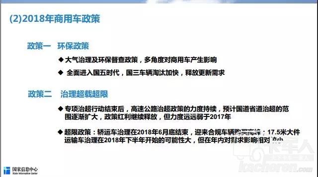 第三個核心就是商用車的政策。梳理下來,有兩個方面對2018年的商用車市場產生影響:第一個是來自于環保方面。在京津冀地區,或者是“2+26”城市,2017年對大氣污染的治理力度是史無前例的,這對2+26個城市的商用車市場有所影響。謝國平說,“現在稍微好一些了,但是這樣治理環境的手段,估計在2018年還會持續,到今年秋、冬季的時候,對商用車還會有所影響。”