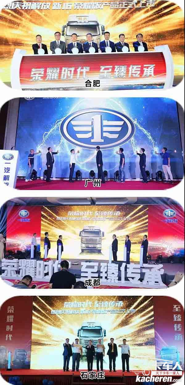 2018年6月6日,“榮耀時代 至臻傳承”——解放新J6榮耀版上市暨2018款牽引系列產品全國總投放儀式,在安徽合肥隆重舉行,同時廣州、成都、石家莊同步舉行了分投放儀式,與用戶朋友們攜手創造一個榮耀時代。