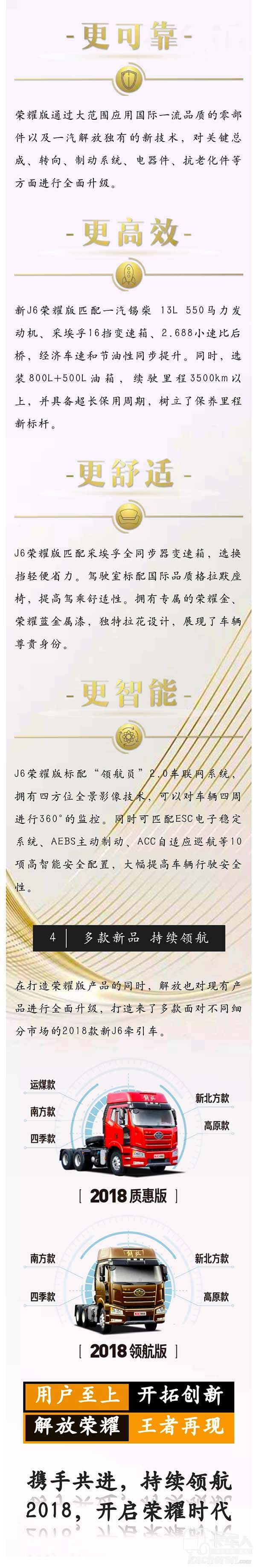 眾所周知,解放J6產品自2007年上市以來,一直受到廣大用戶的青睞。11年以來,累計銷售80余萬輛,持續引領牽引車行業發展。2018年,解放打造了全新重磅系列產品——新J6榮耀版,滿足不同用戶對運營效率的需求,形成了榮耀版、領航版、質惠版的平臺產品格局。