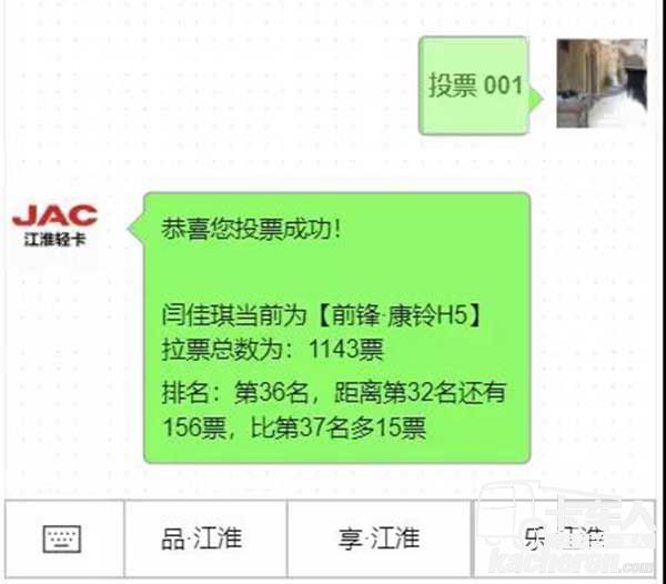 發送參賽者的“投票編號”到【江淮輕卡】公眾號 -> 收到相應系統回復即為投票成功。