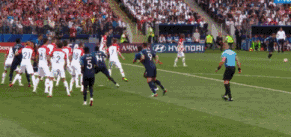 在決賽開場僅18分鐘,法國核心球員格里茨曼因被侵犯倒地,法國隊獲得任意球機會。面對人墻,格里茨曼從容不迫,親自主罰,皮球飛至禁區內被克羅地亞的曼朱基奇不慎頂進自家球門,1-0!法國隊幸運的取得了領先。