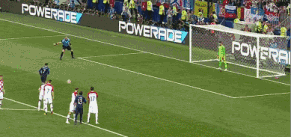 比賽進入第34分鐘時,克羅地亞球員佩里希奇手球犯規。法國隊獲得點球機會。點球看似簡單,實則充滿玄妙。守門員需要對點球隊員的進攻方向和角度進行預判,從而決定擋球方向。格里茨曼主罰點球,他騙過了克羅地亞守門員蘇巴希奇,一蹴而就,2-1!法國隊再次取得領先!